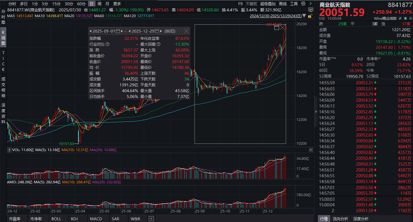 Wind数据显示,2025年9月以来,商业航天指数一路走高。12月29日盘中,商业航天指数冲高至20147.60点,创历史新高。截至当日(12月29日)收盘,指数80个交易日累计上涨22.31%。