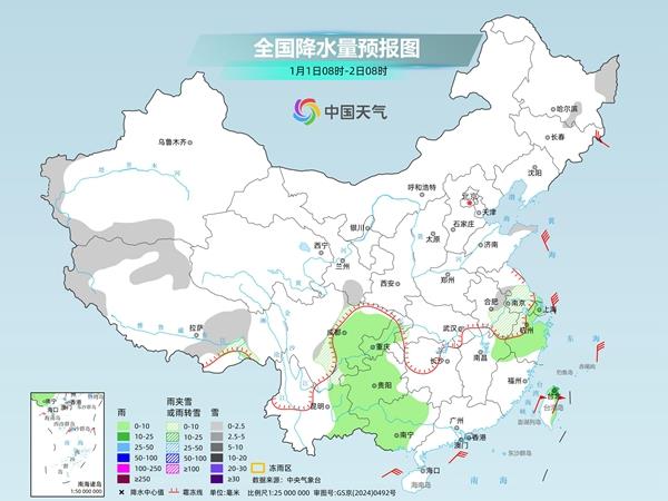 今天,大范围雨雪天气进入最强时段,部分地区或遭遇暴雪。明天是元旦假期首日,寒潮继续南下,雨雪范围也会向东向南推进。后天起,雨雪天气主要在西南地区,全国其他大部将回归晴朗干燥的天气格局。