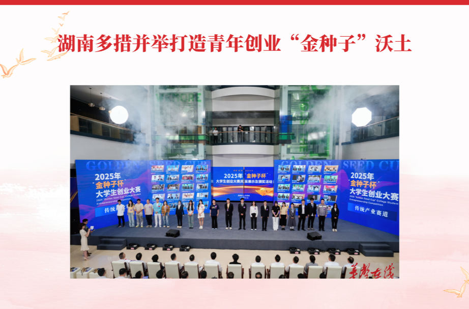 5月25日,首届“金种子杯”大学生创业大赛在长沙落幕,吸引海内外超4万个项目报名,最终评选出96个奖项,其中23个项目拿到大学生创业基金投资支持。同日,“全国大学生创新创业成果转化中心·湖南”正式揭牌,开辟项目落地“快车道”。9月25日,第二届“金种子杯”大赛启动,以更精准的赛道设置、更完善的支持体系和更广泛的全球覆盖,进一步推动“金种子”在湖湘大地生根结果。与此同时,省教育厅出台《支持大学生创业若干措施》,从组织领导、人才培养、导师激励、学业支持等方面进行政策赋能,持续激发高校师生创新创业热情。当前,湖南正以系列赛事、政策、平台建设为契机,致力于打造哺育青年“金种子”的沃土,全力推动全球研发中心城市和年轻人友好省份建设。
