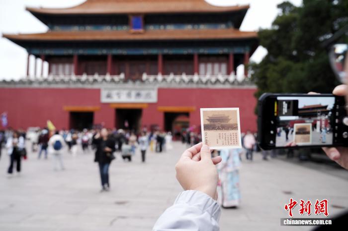 2025年10月10日,北京故宫博物院建院100周年之际,一位游客手持一张故宫藏书票参观打卡故宫神武门。中新社记者 张祥毅 摄