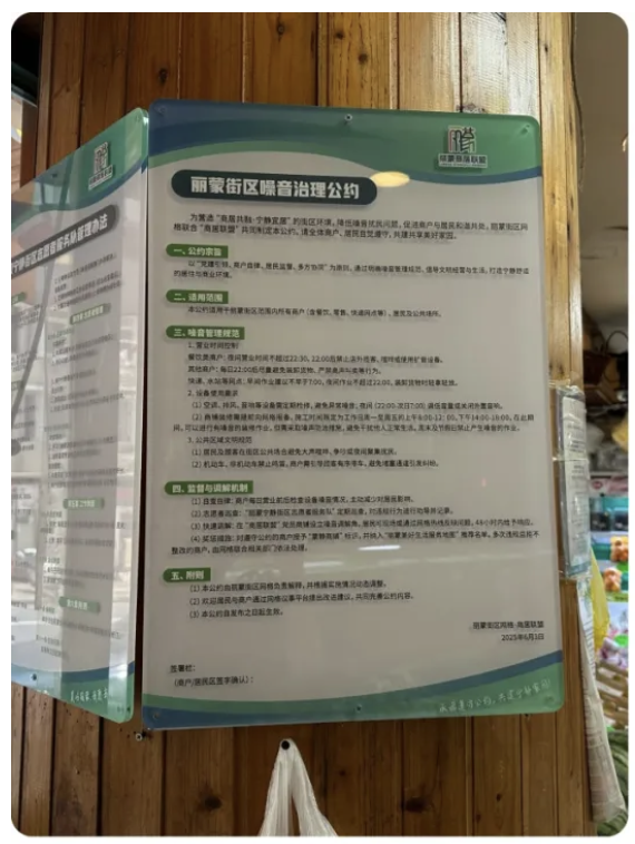 据相关负责人介绍,由于“商铺噪声扰民”问题,长期以来,街区内商户与居民两大群体间的矛盾层出不穷,一度成为网格治理中的瓶颈问题。眼看着两方利益难以调和,矛盾日益凸显,2025年3月,由丽蒙网格牵头,以走访调研、座谈交流等形式,向热心居民、商户代表和居民区党组织征集了意见建议,并形成了街区赋能项目。“我们制定了一份《丽蒙街区噪音治理公约》,明确了商户的降噪责任;组建起了一支丽蒙宁静街区志愿者队伍,在商铺和网格工作站设立‘噪声调解角’,针对早晚高峰关键时段,建立商居沟通缓冲渠道,促进矛盾就地化解。”相关负责人告诉记者,在针对噪声扰民的治理过程中,网格打破了原来主管部门“单打独斗”的工作模式,例如,《公约》在制定过程中,公安、生态、城管、消防等各相关条线部门与各居民区党总支共同破题。