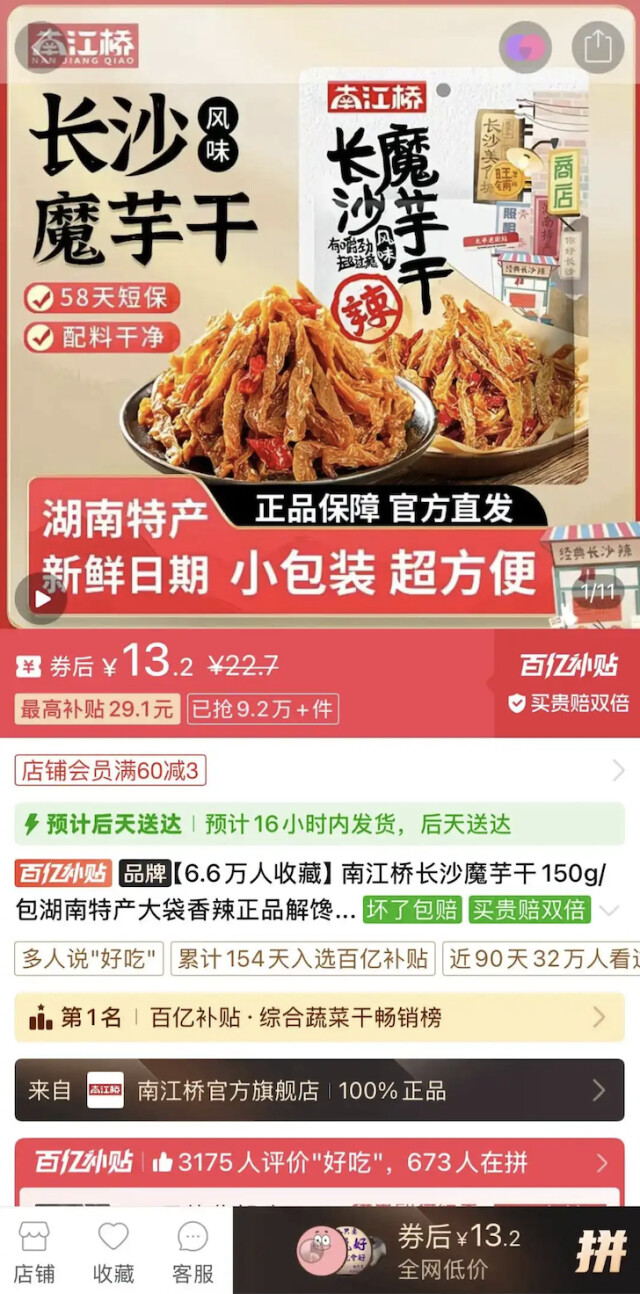 2023年9月,南江桥魔芋干在拼多多平台上线,当月销售额超300万元,10月达600万元,12月突破1000万元。“去年,我们线上销售额1.1亿元。”杨方介绍,仅凭魔芋干这一个大单品,南江桥在成立后第一个完整年度一举闯入“亿元俱乐部”,其崛起速度之快,令一众传统休闲食品品牌为之侧目。